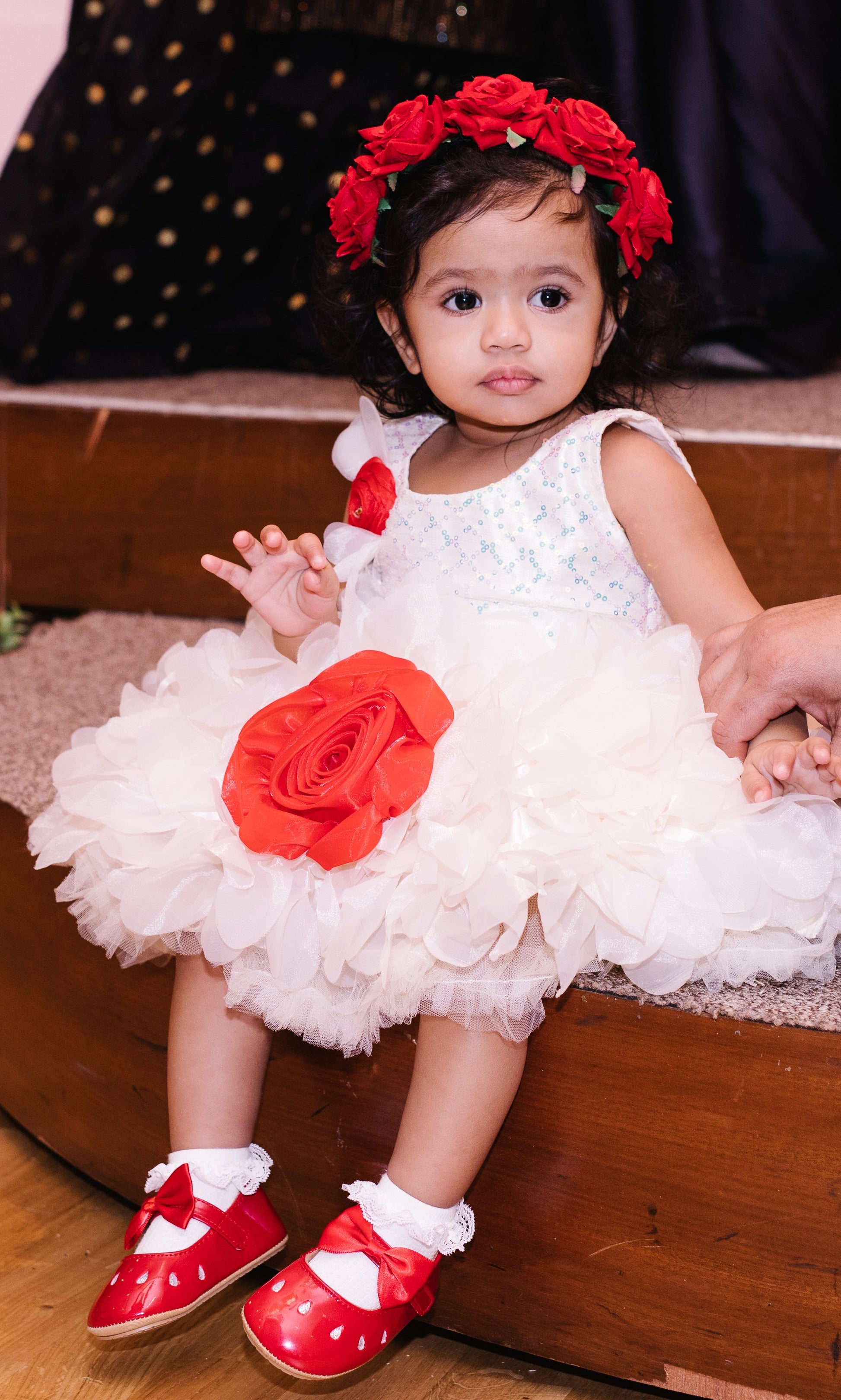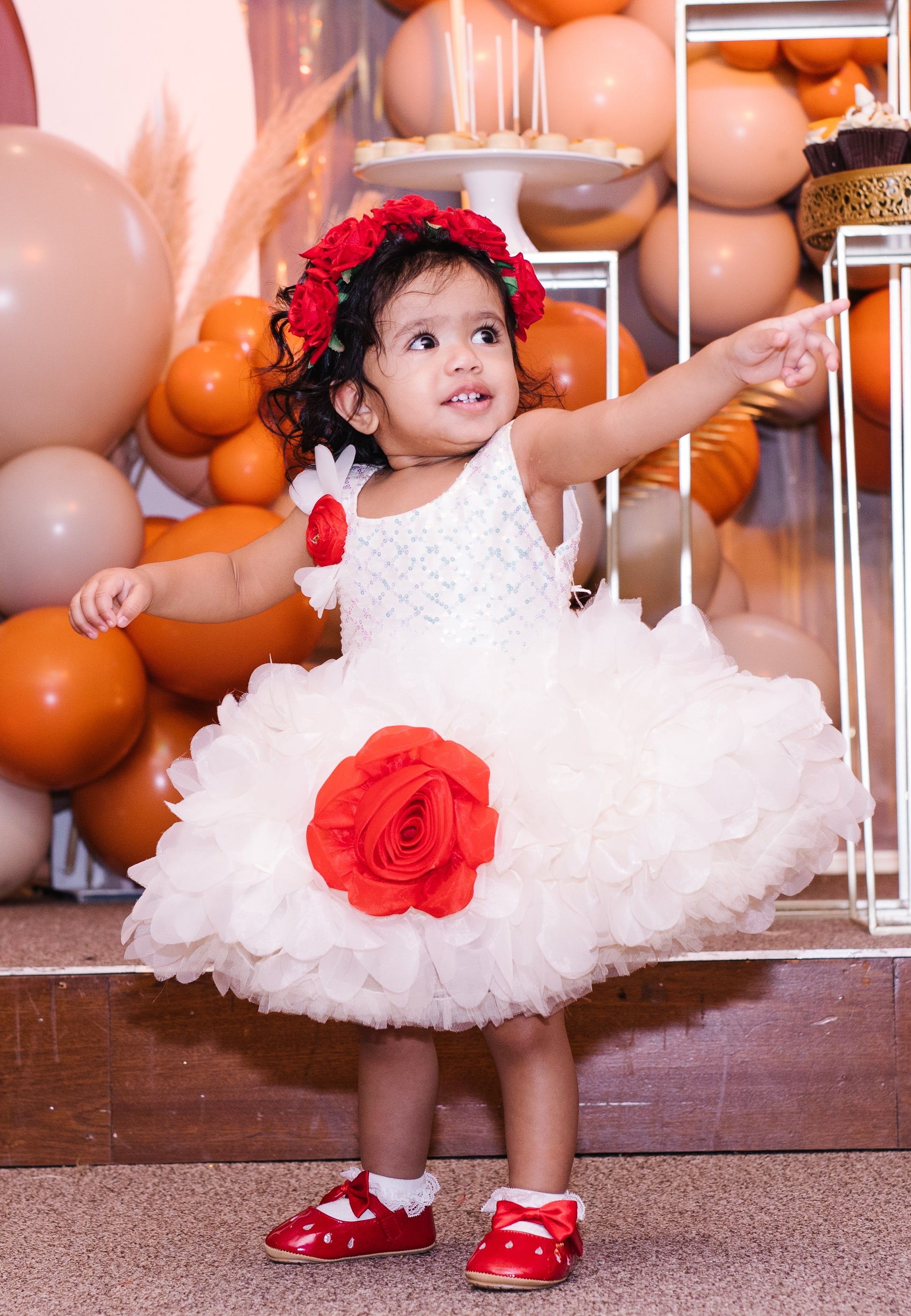 Let your little star steal the spotlight in this enchanting White Sleeveless Fit & Flare Dress, where classic charm meets playful sophistication. Designed with a Western flair, this occasion-ready piece features a pristine white canvas adorned with a dramatic oversized 3D rose in vibrant magenta and olive huesβan eye-catching detail that turns every moment into a photo opportunity.